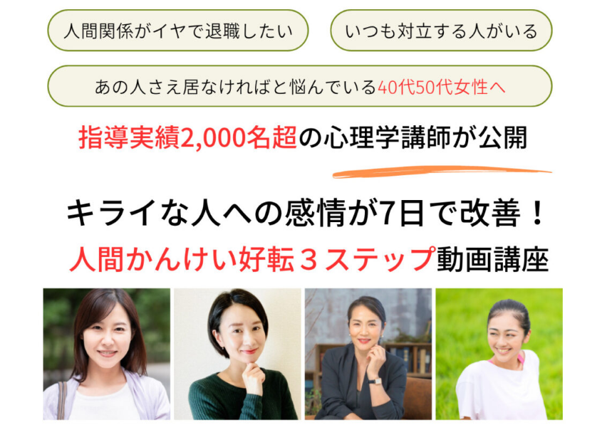 「人間かんけい好転3ステップ動画講座」は、指導実績2,000名超の心理学講師が教える人間関係改善法です。