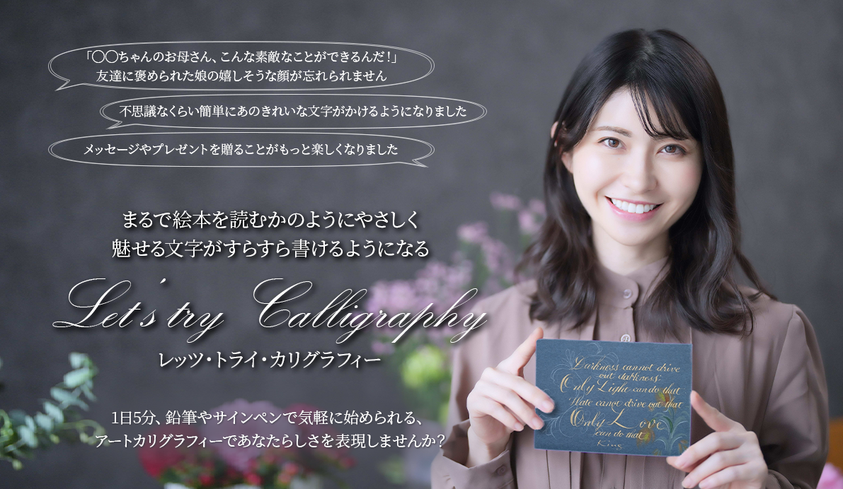 「レッツ・トライ・カリグラフィー」は、まるで絵本を読むかのようにやさしく、魅せる文字がすらすら書けるようになるカリグラフィー教材です。