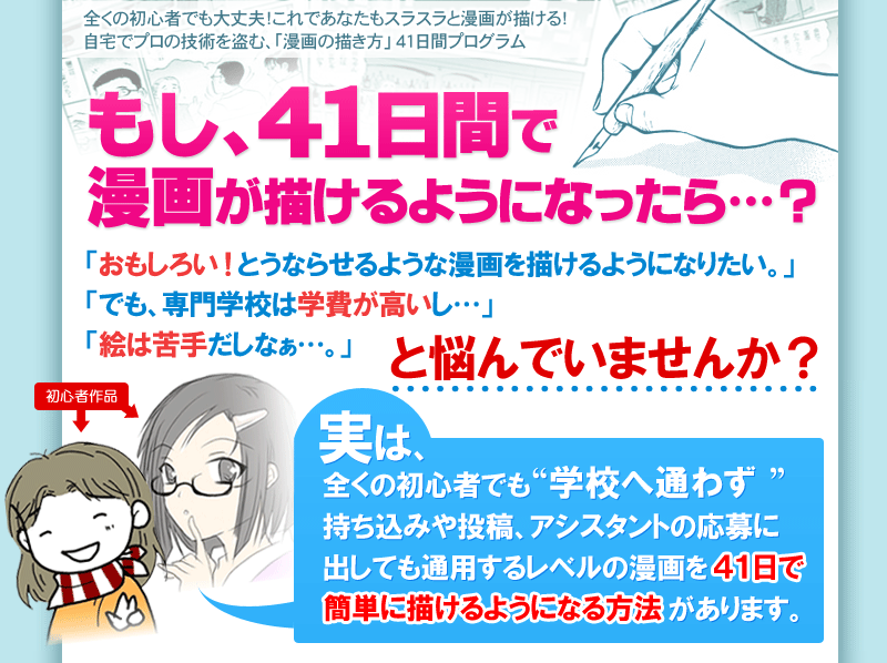 「プロが教える「漫画の描き方」41日間プログラム」は、ちばてつや賞 をはじめ、数々のコンテスト入賞実績を持つプロの現役漫画家が、他人には絶対に見せなかった作画方法からストーリーの作り方まで、上手に漫画を描く方法の全てを詰め込んだ漫画教材です。