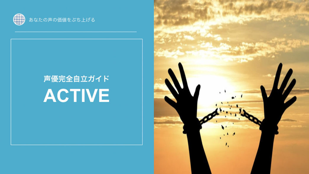 『声優完全受注ガイド「ACTIVE」』 は、声優が本業の声で稼げるようになり、自分の目標を、事務所や業界に委ねずに自分で動き出す方法をまとめた動画コンテンツです。