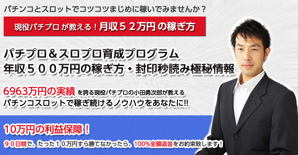 「パチプロ&スロプロ育成プログラム年収500万の稼ぎ方・封印秒読み極秘情報」は、年間勝率100%、月間勝率96%、パチンコとスロットで7000万円以上稼いだ現役パチプロ小田が本物の勝ち方を教えるパチプロ&スロプロの指南書です。