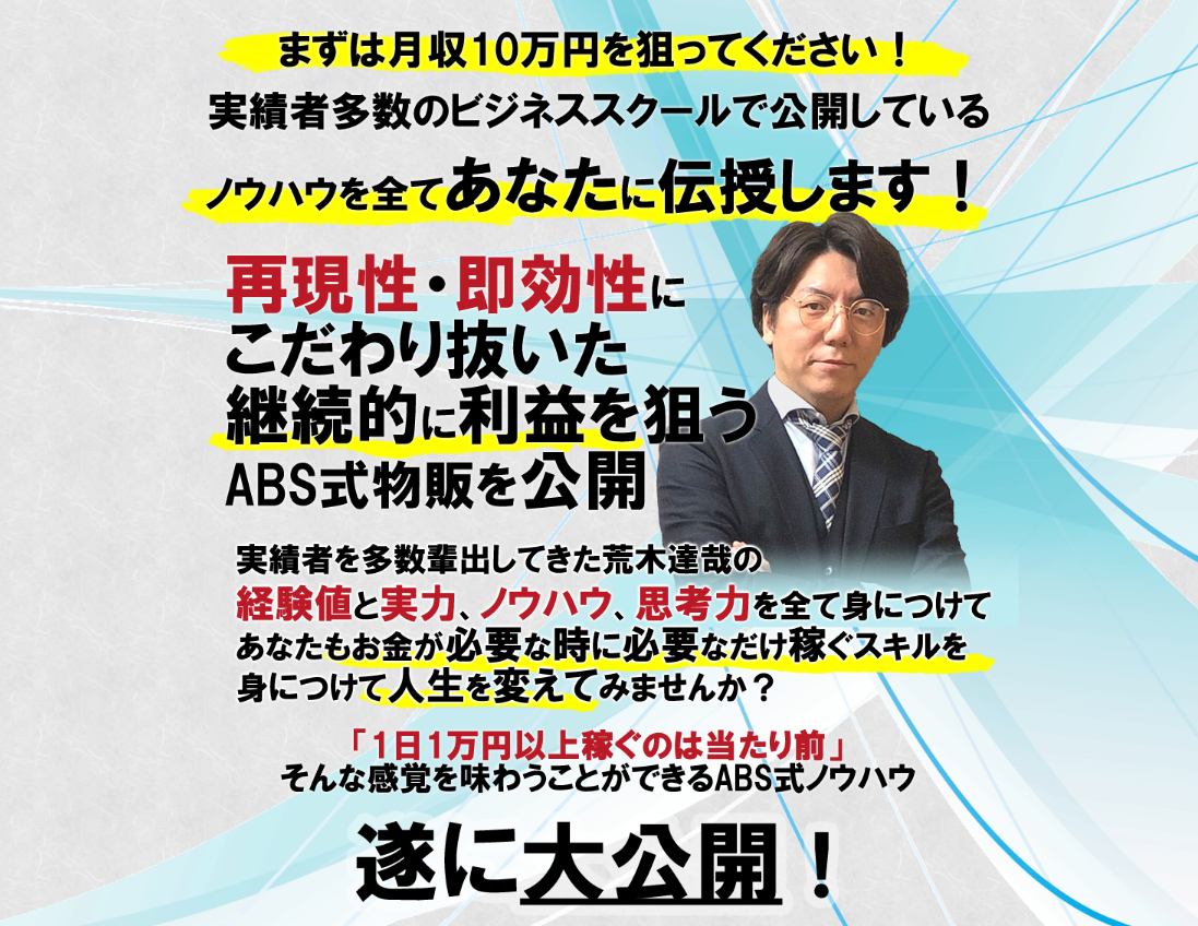 「ABS式中国輸入転売プログラム」は、実績者を多数輩出してきた荒木達哉氏の物販ビジネス教材です。