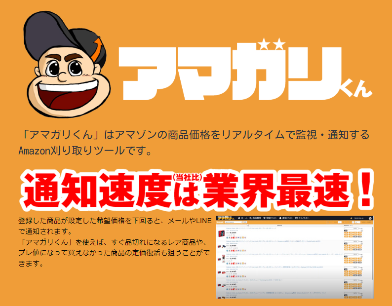 「アマガリくん」は、アマゾンの商品価格をリアルタイムで監視・通知するAmazon刈り取りツールです。