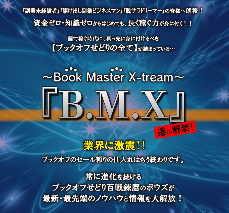 「BMX〜Book Master X-tream〜」は、ブックオフせどりの最新ノウハウを中心に、未経験者から経験者までを対象とした点は転売ビジネスノウハウです。