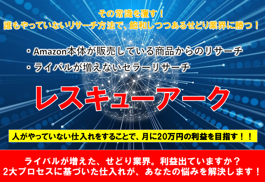 「レスキューアーク」は、Amazon本体が出品している商品で利益を取るせどりノウハウです。