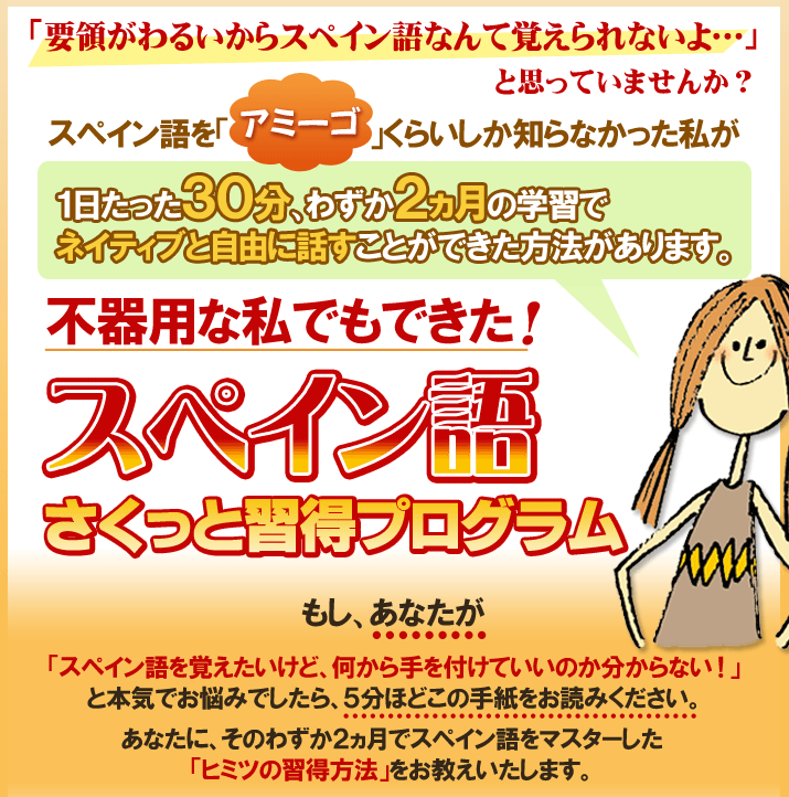 『【立体的スペイン語学習法】 スペイン語さくっと習得プログラム』は、従来の教材や語学スクールでは決して教えてくれない、簡単でしかも即実践で使える『真のスペイン語習得法』です。