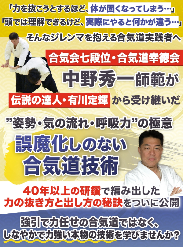 「有川定輝から受け継いだ誤魔化しのない合気道技術」は、中野師範が長年の経験から導き出した合気道教材です。