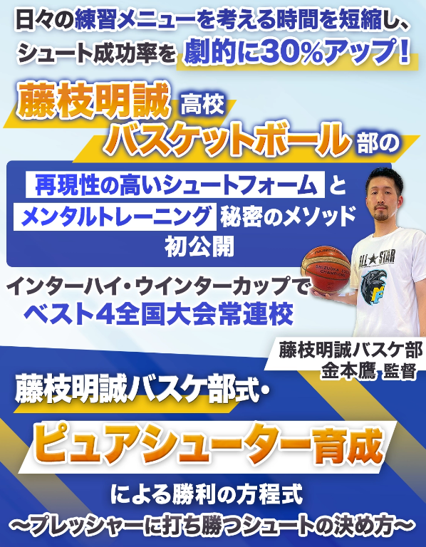 「藤枝明誠バスケ部式・ピュアシューター育成による勝利の方程式」は、再現性の高いシュートフォームと、メンタルトレーニングの秘密のメソッド。