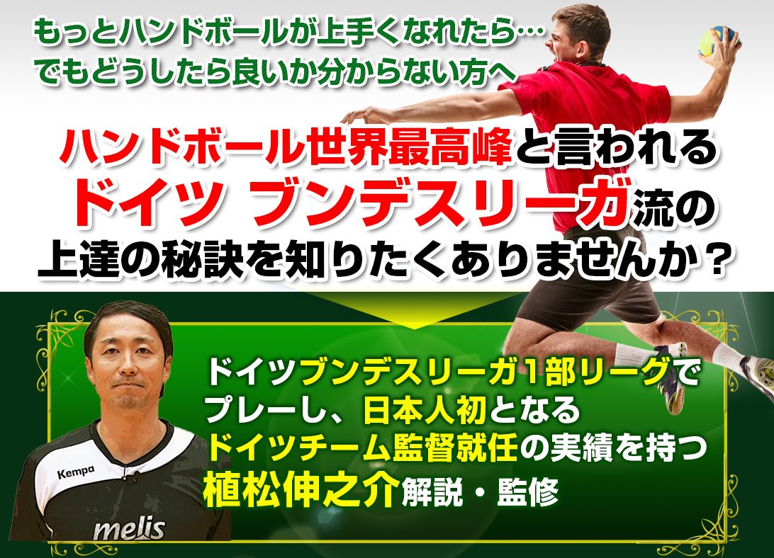 「個人技術を伸ばすハンドボールドリル」は、ドイツブンデスリーガ1部リーグでプレーし、日本人初となるドイツチーム監督就任の実績を持つ植松伸之介氏が解説・研修を務めるハンドボール上達DVDです。