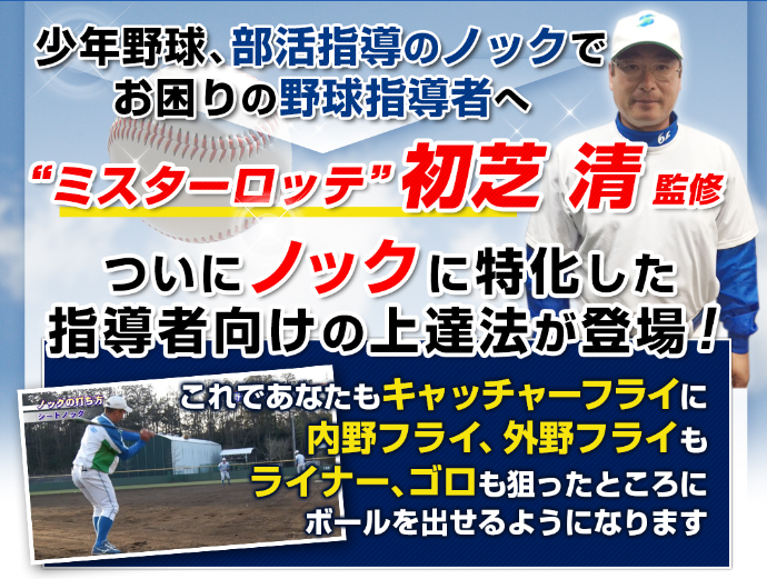 「野球ノック上達革命〜ノックに特化した指導者向け上達法〜」は、元千葉ロッテマリーンズの初芝 清選手と元阪神タイガースの前田 忠節選手が監修したノック上達DVDです。