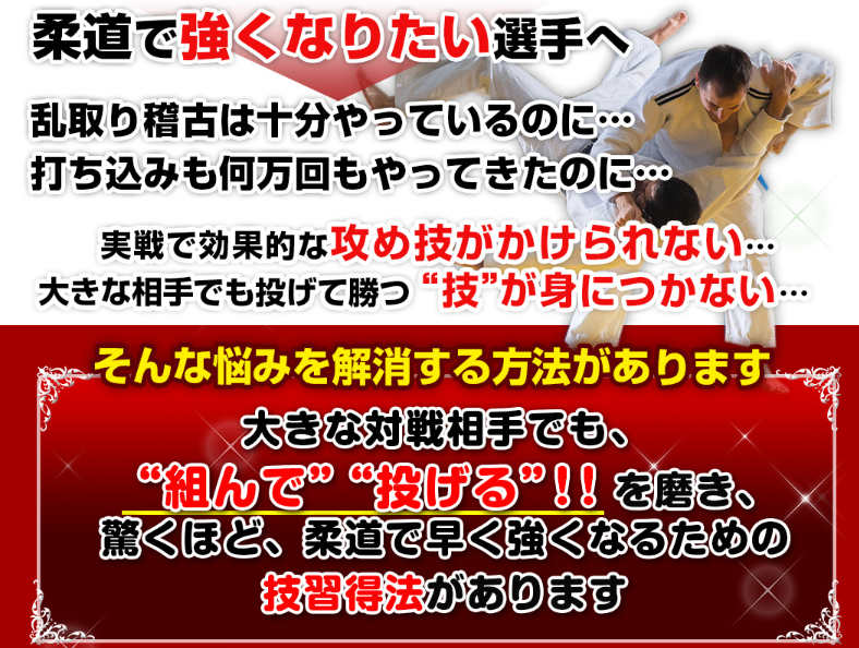見栄えある“投げ技”で勝つための秘訣だけでなく、固め技の技術、さらに相手の技の“防御法”を含めた、強い柔道家になるために必要な全てが、このプログラムの実践によって、身に着けることができます。