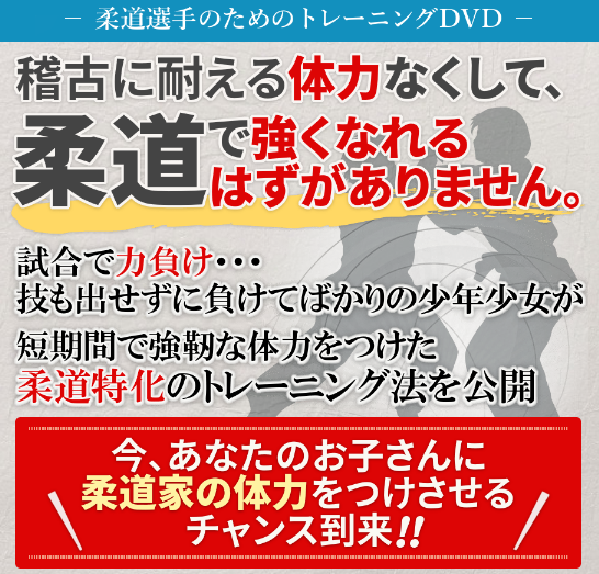 このDVDがあれば、できるだけ短時間でシンプルに、そして何よりも柔道に最適な、正しいフォーム、筋肉へのアプローチをしたトレーニング方法を知ることができます。