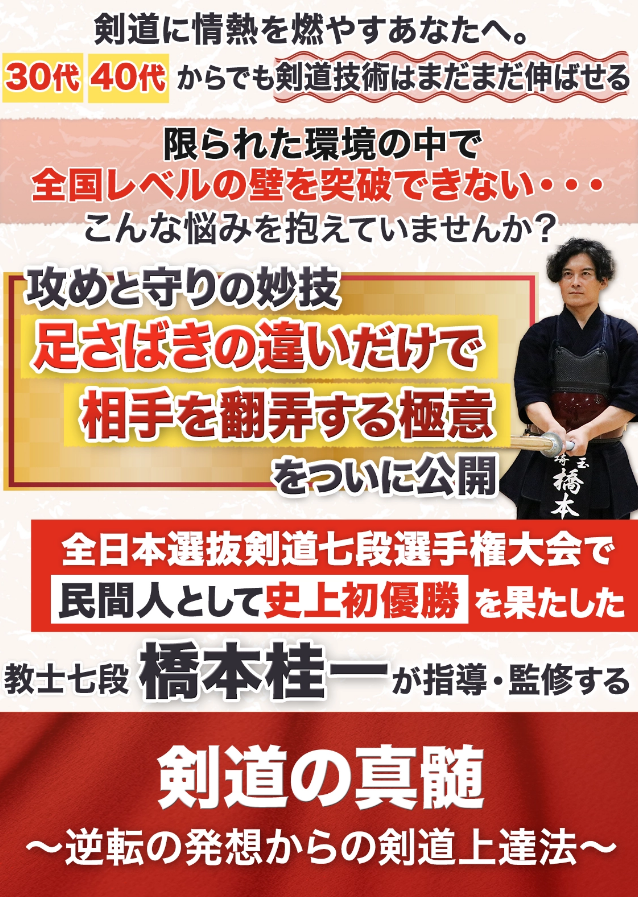 この「逆転の発想からの剣道上達法」は、無料で配信されている稽古法や小手先のテクニックではなく、橋本教士七段が、日本の第一線で多くの剣士を指導し続けてきた長年の経験に基づいて作られています。