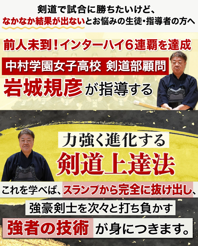 「力強く進化する剣道上達法」は、前人未到のインターハイ6連覇を達成した中村学園女子高校の剣道部顧問・岩城監督が指導するオンライン動画(DVD)です。