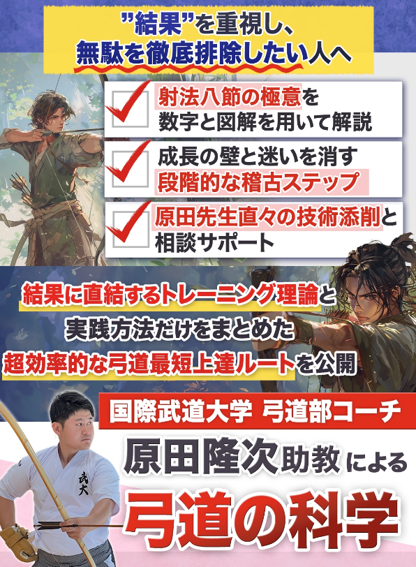 そのような研究と技術指導経験がある原先生だからこそ、無駄を省き結果にフォーカスした、超効率的な弓道上達法を教えることができるのです。