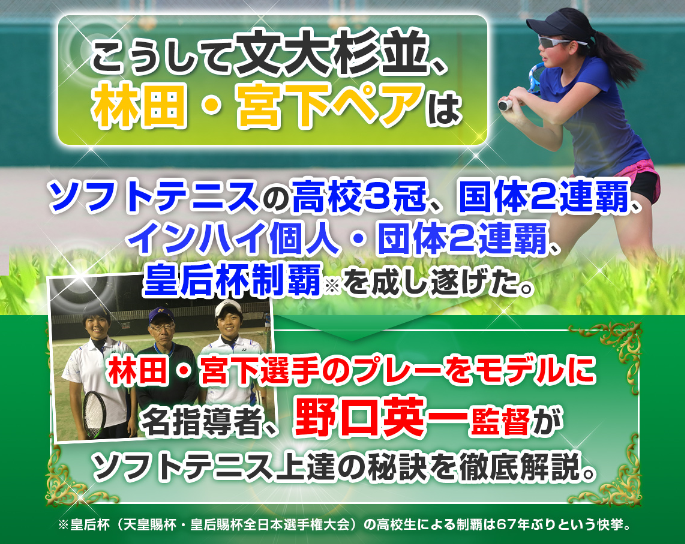 インターハイ2連覇、高校生としては67年ぶりの快挙となる皇后杯優勝というソフトテニスの歴史に残るといってもいい実績を残した林田リコ選手と、宮下こころ選手にも出演していただいており、トップ選手のプレーをふんだんに収録しています。