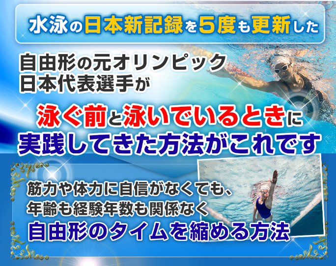 山口さんが日本代表選手としてオリンピックに2度、世界水泳に4大会連続で出場し、これまで5度の日本新記録を更新した選手経験をもとに、力のない人でも自由形でスピードアップできる方法をまとめてくださっています。