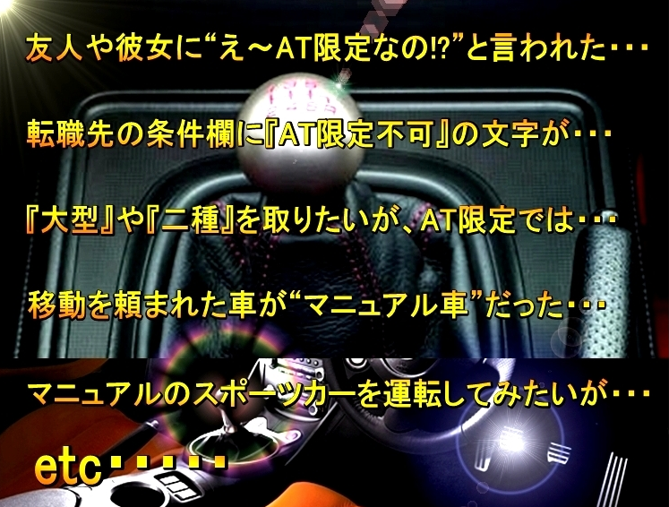 この教材で 知識(運転方法・審査基準)とポイント、そしてコツをつかめば、早く、安くAT限定を解除することが可能です。